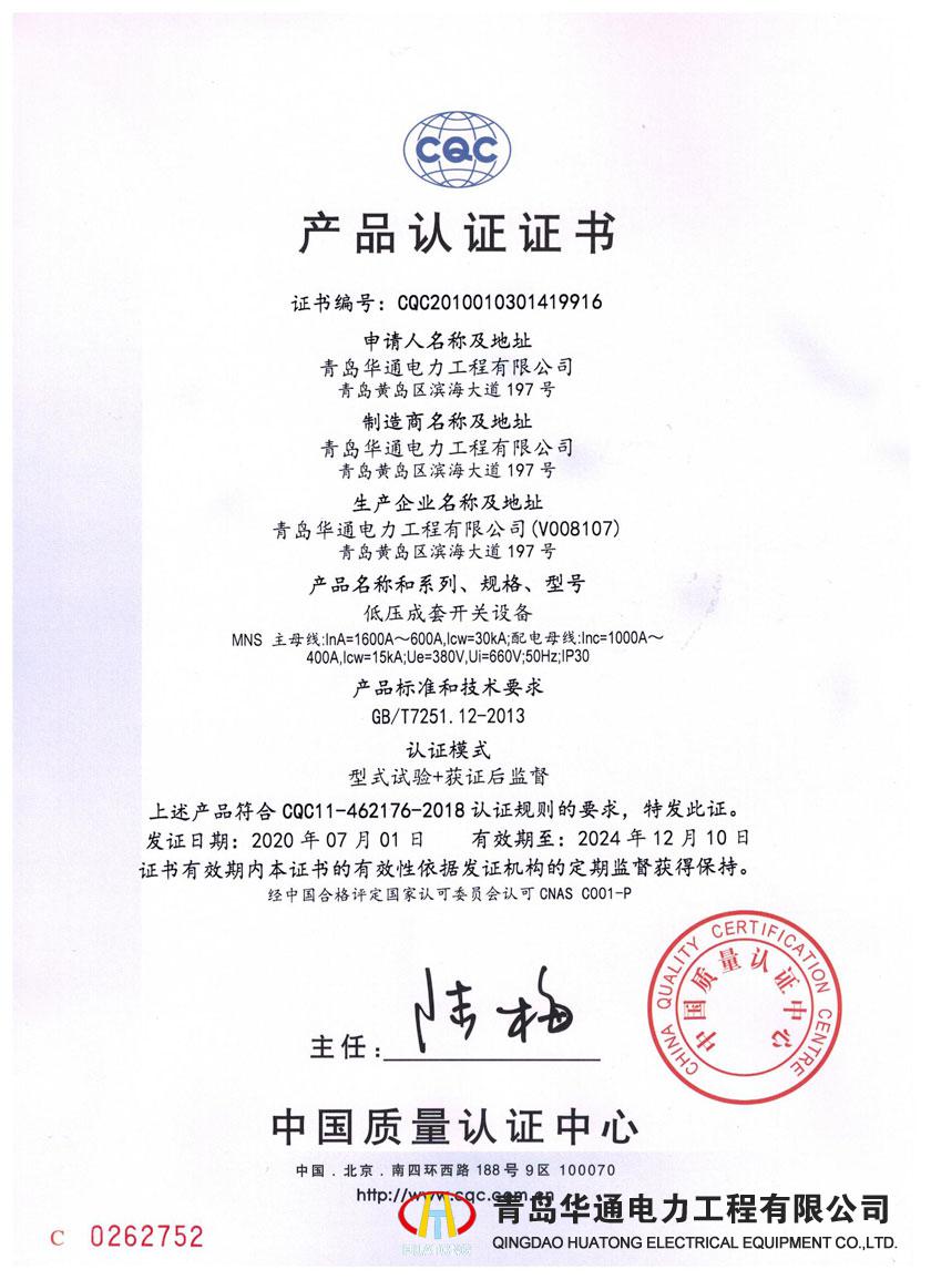 MNS產品認證證書